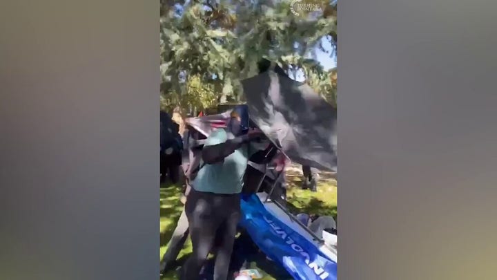 The conservative group was in the midst of hosting a ‘Prove me Wrong’ event with a guest speaker when protesters destroyed camera gear, a tent, event signage, flipped tables, and assaulted group staff, TPUSA said at the time.