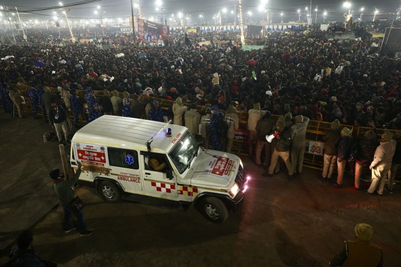 Video shared on social media showed ambulances rushing past crowds of people to the site of the crush and security personnel helping devotees as scattered blankets and belongings lay strewn on the ground.